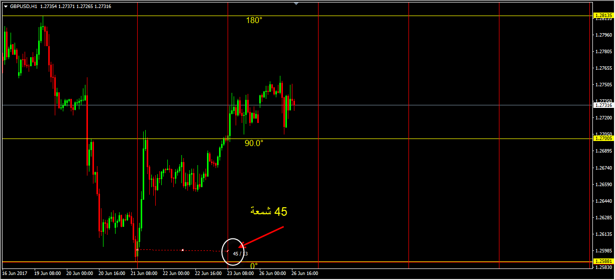 - تُعتبر هذه الزاوية الأكثر استخدامًا في التحليل الفني. تشير إلى حركة سعرية متساوية في الزمن والمسافة. بمعنى آخر، إذا تحرك السعر بمقدار نقطة واحدة للأعلى، فإنه يتطلب فترة زمنية واحدة.